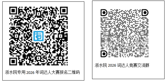 参赛报名:请同学们微信扫码 “浙水院专用2026年词达人大赛学生报名二维码”,另请钉钉扫码加入“浙水院2026词达人竞赛交流群”,便于后续交流。
