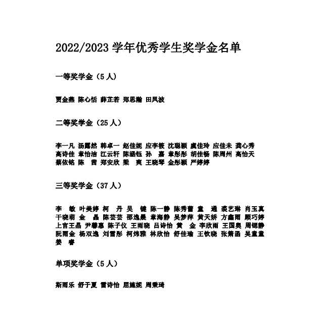 根据《浙江水利水电学院学生奖学金评审办法》的规定,经国际教育交流学院审定,贾金燕等72名同学获得2022/2023学年优秀学生奖学金,其中一等奖学金5名,二等奖学金25名,三等奖学金37名,单项奖学金5名。现将名单予以公布。请广大同学予以监督,如有异议请联系院学工办。